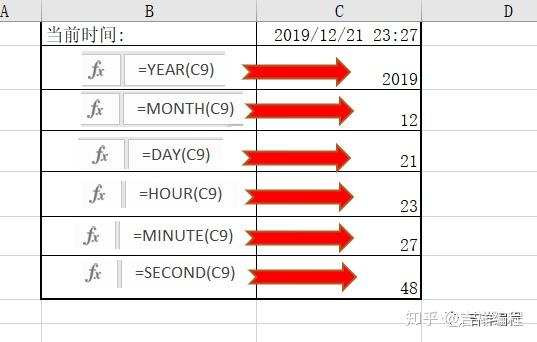 函数year、month、day分别返回日期值对应的年份、月份、日期,函数hour、minute、second分别返回日期值对应的时、分、秒,见下图;
