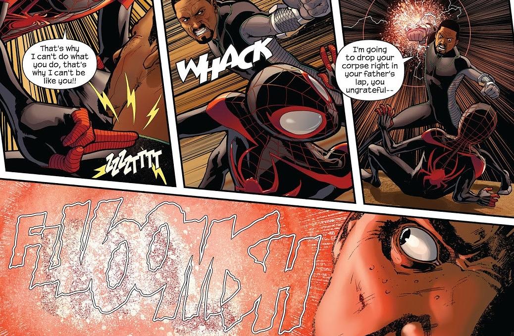 后来在神盾局遭到电光人袭击时,迈尔斯因协助将其击败而得到了尼克·费瑞的认可,获得局长赠送的一套黑色蜘蛛战衣,迈尔斯就这样成为了终极宇宙中新的蜘蛛侠。
