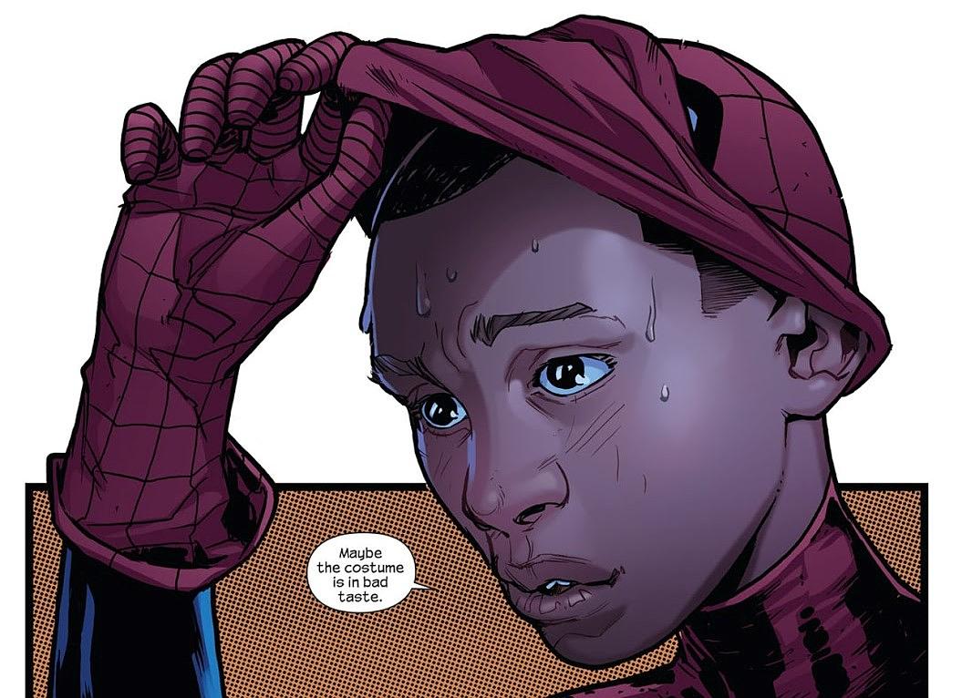 刚出道的迈尔斯由于身穿廉价的蜘蛛侠cos服装,常被路人吐槽衣着品味糟糕。