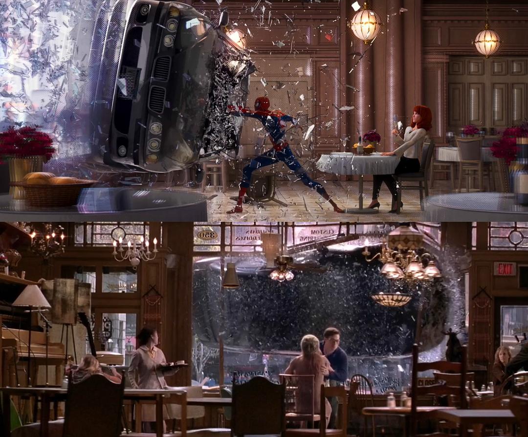 在影片开场蜘蛛侠的自述中,出现了托比版《蜘蛛侠》三部曲的几个经典场景。