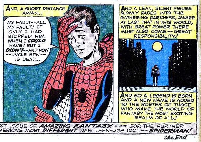 在影片一开始由本叔叔说出,这句话最早出现在蜘蛛侠初次登场的《惊奇幻想》第15期,原来只是书中的旁述,在后来的漫画中演变成本叔叔对彼得·帕克最深刻的教诲,令他决定运用自己的能力成为英雄。