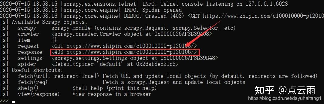 scrapy shell -s USER_AGENT='Mozilla/5.0' https://www.zhipin.com/c100010000-p120106/
