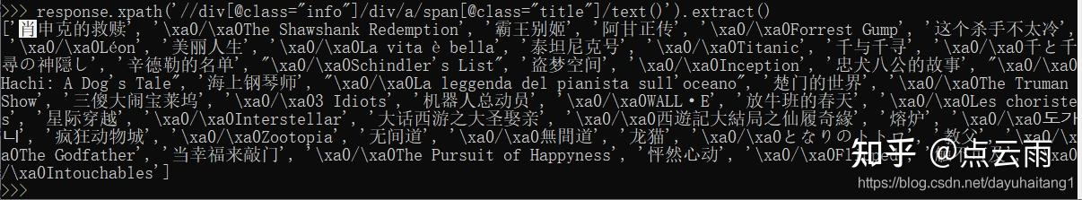 item['movieName']=movieInfo.xpath('./div[@class="info"]/div/a/span[@class="title"]/text()').extract_first() #提取电影名字