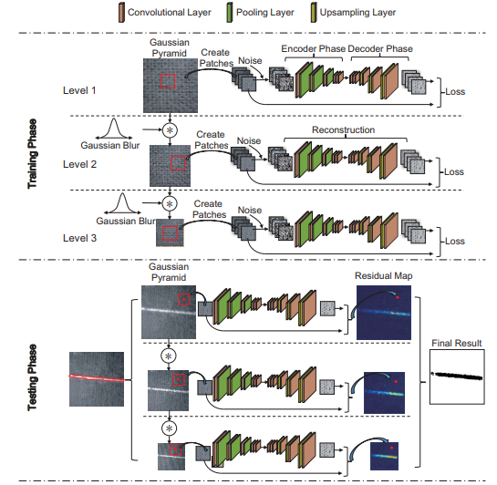 作者采用结合图像金字塔层次结构思想和卷积去噪自编码器网络(CDAE)实现对布匹纹理图像的缺陷检测,其总体结构如下图所示。
