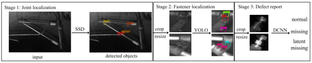 本文作者利用深度卷积神经网络(DCNNs)结合SSD,Yolo等网络方法构建了一个从粗到细的级联检测网络,包括固件的定位、缺陷检测与分类,其实现流程如下图所示。