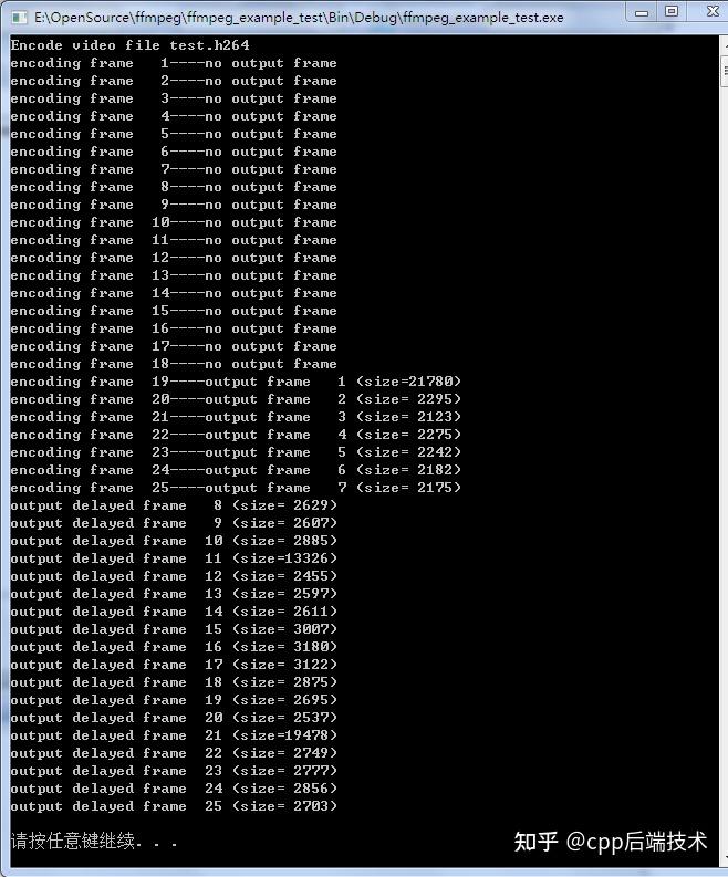 编译......error!原来编译器不认识X264Context,一定是忘了包含头文件,查看源代码,发现这是一个对外不公开的结构体,我无法通过包含头文件来包含该结构体,于是抱怨ffmpeg怎么搞的!也许是给予解决问题,同时验证之前的的理解正确与否,我采用了最粗暴的方法,直接将该结构体复制到我的文件中,当然这个结构体中有一个名为class的成员需要更改一下名字,因为我的项目是C++开发的,这个而class是C++的关键字,同时也要将x264.h和x264_config.h头文件复制到你的工程中,因为X264Context中的几个成员类型如x264_param_t、x264_t等是在x264.h中定义的,而x264.h又包含x264_config.h,好在x264_config.h没有在继续包含别的文件了(这也再次证明了我们在开发的一条规范的好处:尽量在头文件中不再包含其他头文件,而是尽量使用向前声明,这样方便代码的移植)。折腾一番之后,编译代码,终于顺利通过了,此时,正如我的想象一样,编码果然没有任何延迟了!(在我的工程代码中却是没有哪怕一帧的延迟,但在这个测试代码中却存在一帧的延迟,当然一帧的延迟几乎没有任何影响),见下图运行效果: