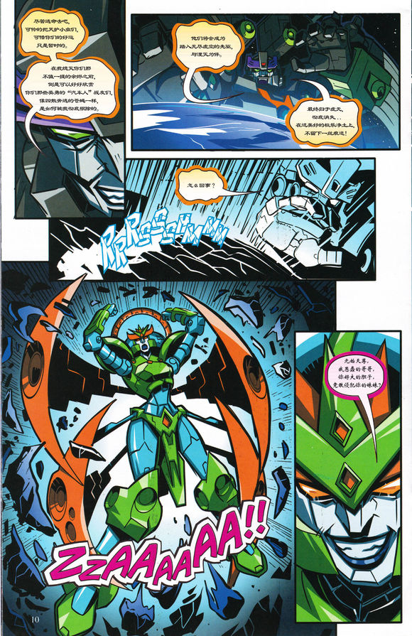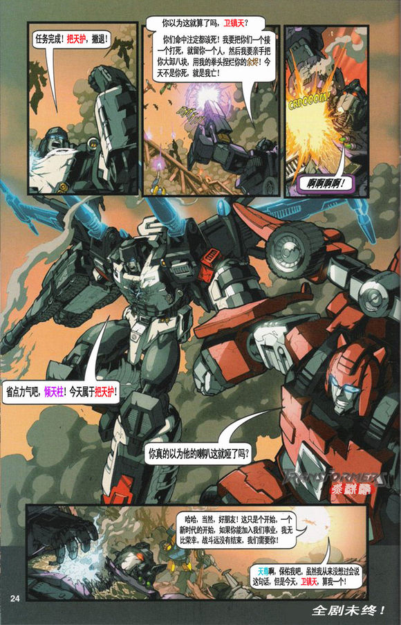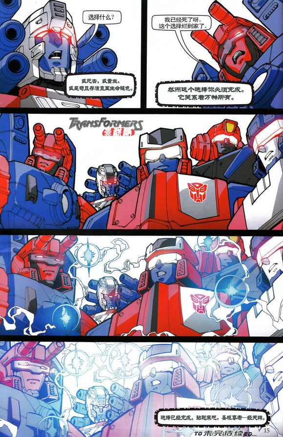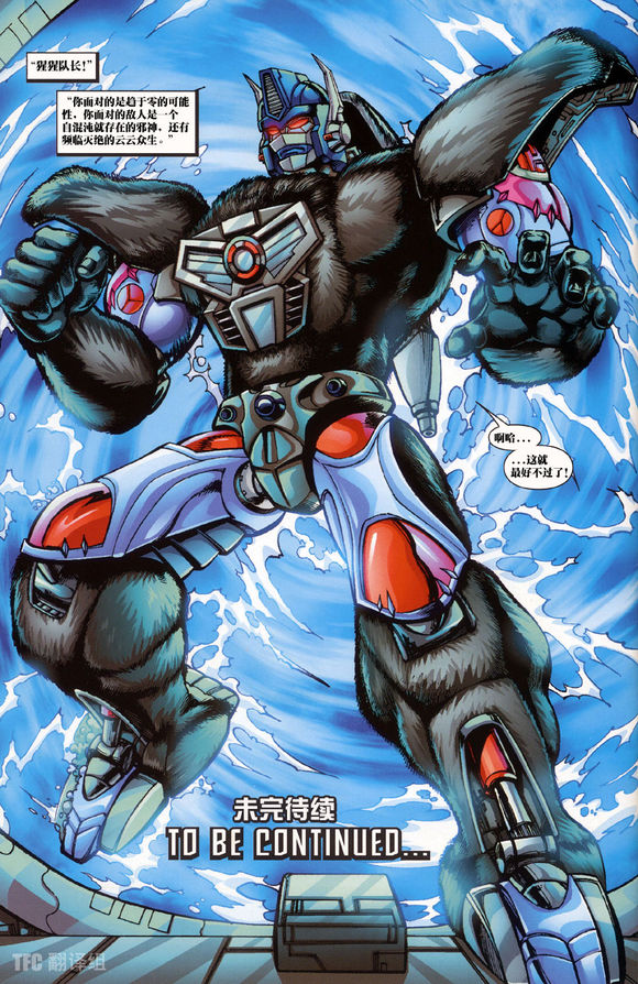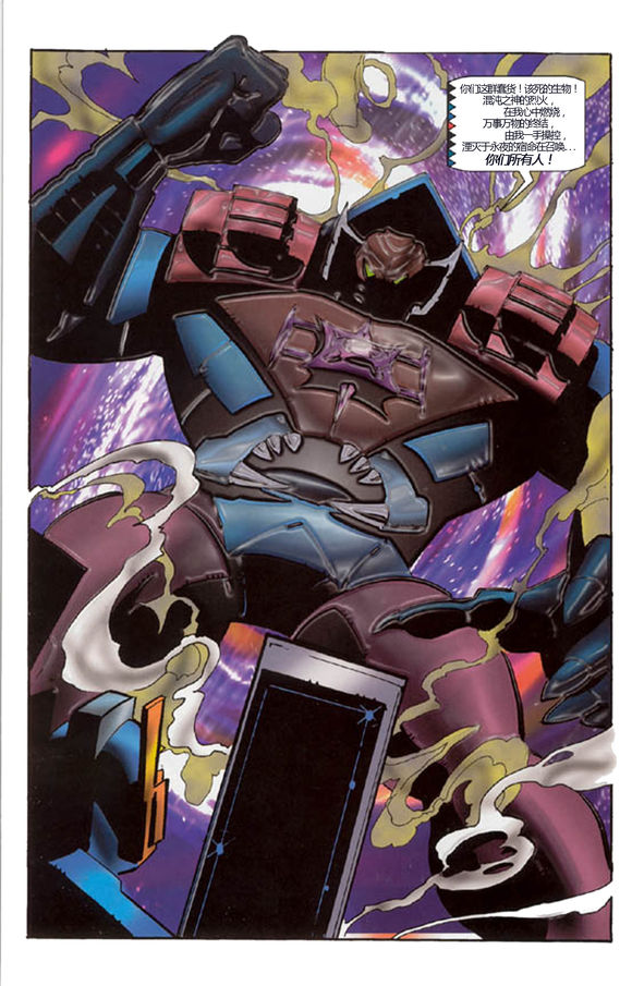 10、2015《另一面》:本章大量致敬86大电影,不过是镜像版本,十分有意思。通天猛犸小队来到镜像宇宙与敬破天合流,此时镜像宇宙有两个地球,一个经典宇宙的,上面镜像通天晓(捅天枭)正在准备继续毁灭其他宇宙,一个镜像宇宙自己的,倾天柱正在攻击正义霸天虎(把天护)。双方合计之后,通天猛犸小队赶去经典地球,惊破天部队赶去镜像地球。惊破天和镜像地球的擎天柱,镜像热破等人上演镜像版86大电影,最后倾天柱被惊破天击倒,欺扯人撤退,路上热破把擎天柱以及受伤的人员扔下船,仍然致敬86大电影小红扔威震天。在经典地球,通天猛犸VS捅天枭,正义版本打邪恶版本,通天猛犸不敌有魔晶剑的捅天枭,最后经天纬穿越回来到达战场,用集齐的碎片加上源母矩阵,合成星辰剑,之后把捅天枭流放。看过AEC三部曲宇宙大帝奇点带来的影响,到通天晓扎爆宇宙,种种事情的经天纬,用魔晶剑与星辰剑合一赋予的力量,在十三元祖见证下,关闭了多元宇宙,从此上至天尊大帝,下至普通人,都不再有多元唯一,任何宇宙的任何人都是独立的存在了。(通俗点说,一个宇宙就算乱成一锅粥,其他宇宙也不太会有连带影响了,彻底踏实了),以后穿越这种事只有特殊人员才能干。与此同时,倾天柱遇到镜像宇宙正义宇宙大帝,将他改造成正义的星皇,同样打断了镜像热破的加冕仪式,热破复苏镜像赛博坦,觉醒成镜像元始天尊,之后经典宇宙地球觉醒,真身是大帝天尊的妹妹,负责守护生命能量的另一个神:盖亚。盖亚消灭镜像元始天尊,之后变成星球长眠,在镜像宇宙成为新-赛博坦。最后星皇、通天猛犸、惊破天三个大佬守护赛博坦。而经典宇宙威震天自从和通天猛犸一起穿越过来后,一直潜伏,准备着新的阴谋。