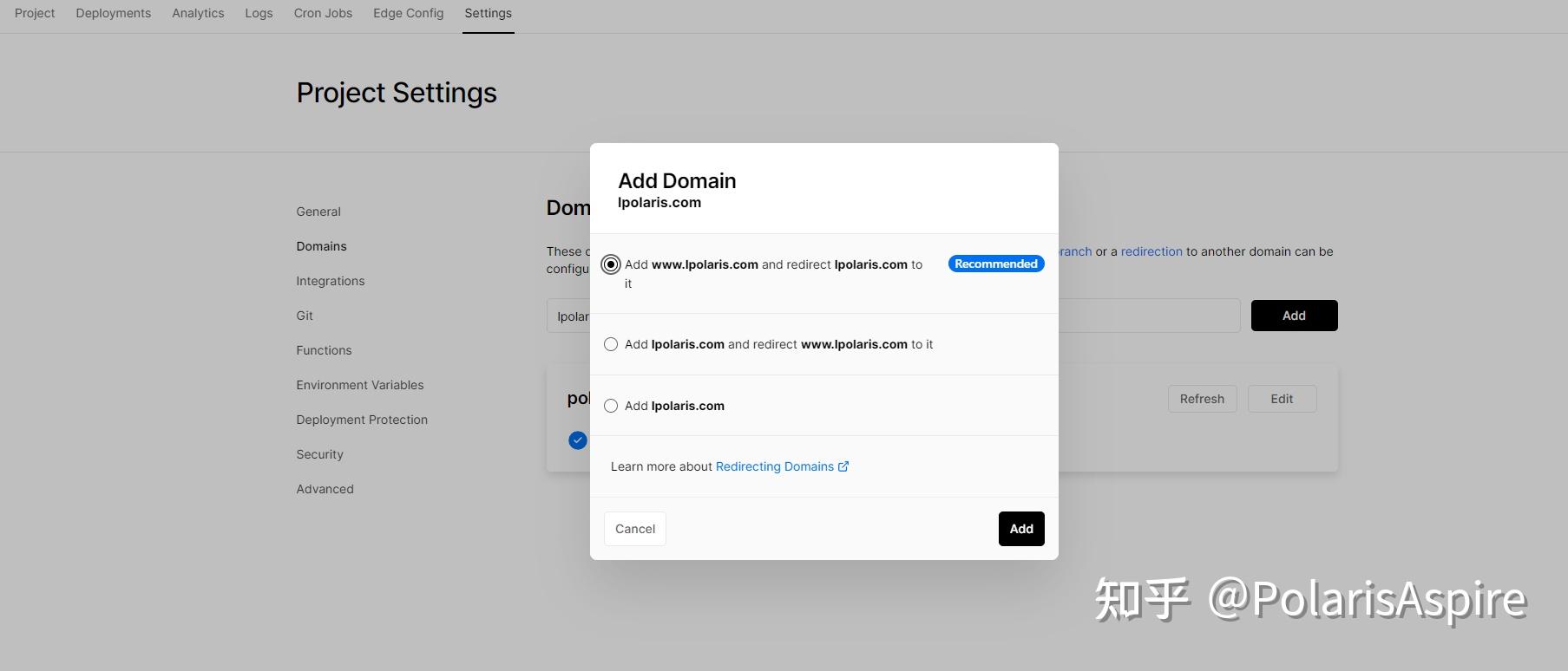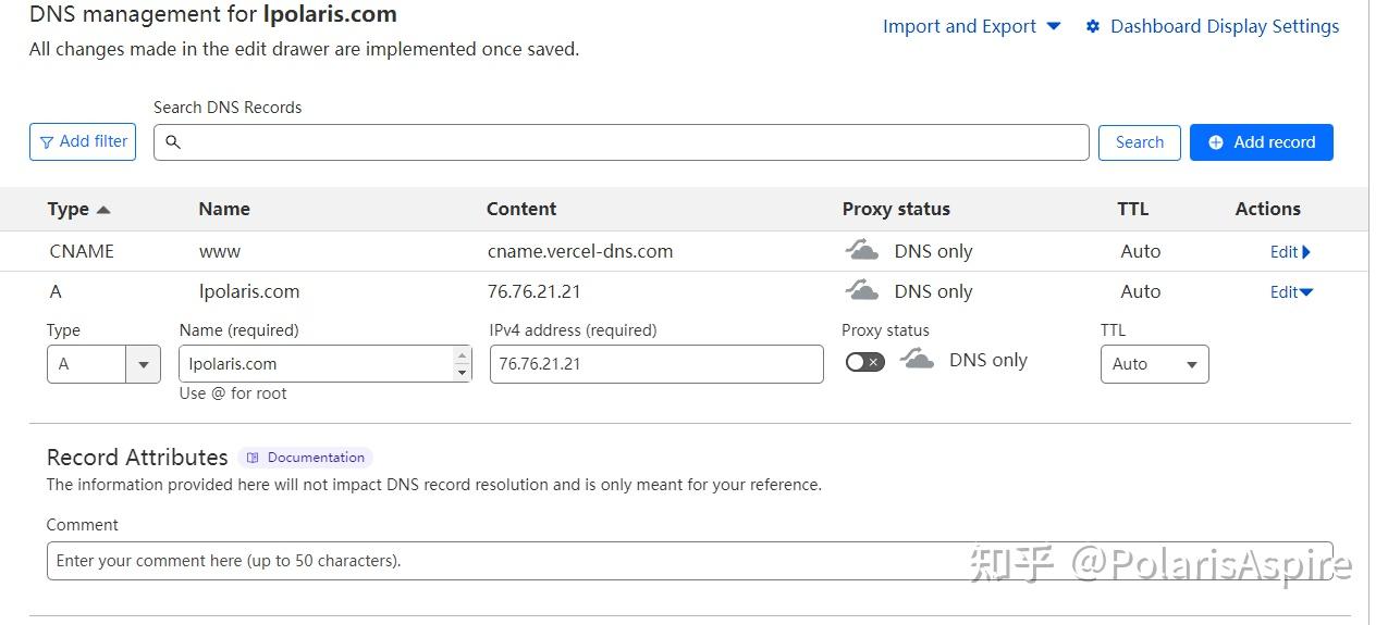 这里需要配置 [ http:// lpolaris.com ] 的A解析 ,以及 [ http://www. lpolaris.com ] 的 CNAME 解 析
