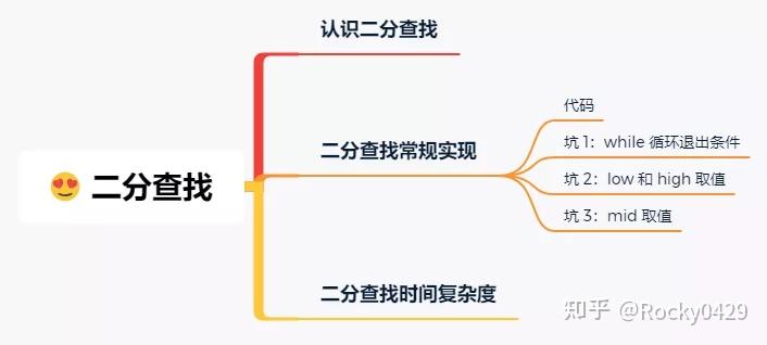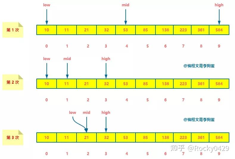 利用二分思想,设定 low 和 high 表示需要查找的区间的左右下标,mid 表示需要查找区间的中间元素下标。
