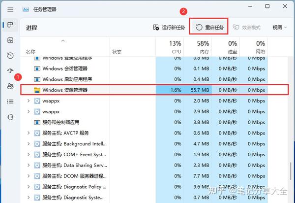 3、选择【Windows 资源管理器】进程后,再点击右上方的【重启任务】,即可重启Windows 资源管理器,这其实是Windows 资源管理器进程explorer.exe结束后,又重新启动的过程;
