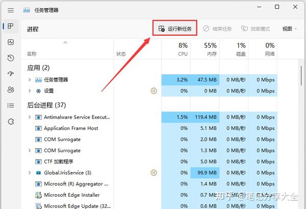 4、如果不小心结束了Windows 资源管理器进程,也可以在任务管理器窗口,点击右上方的【运行新任务】;
