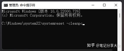 1、命令提示符中,输入并按回车执行【systemreset -cleanpc】命令,可以唤起系统重置;