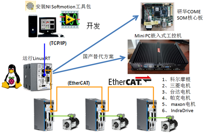 现在这个问题可以得到满意的解决了,我们可以将NI Linux RT实时系统直接安装到国产的X86控制器里面,代替NI cRIO控制器。比如可以选择研华的COME(SOM)核心板、mini PC嵌入式主板或者小型mini工控机或者淘宝上很便宜的X86控制器都行。硬件成本从800~5000之间随便选(不同配置的CPU、内存、硬盘),可以极大地降低整个运动控制系统的硬件成本。