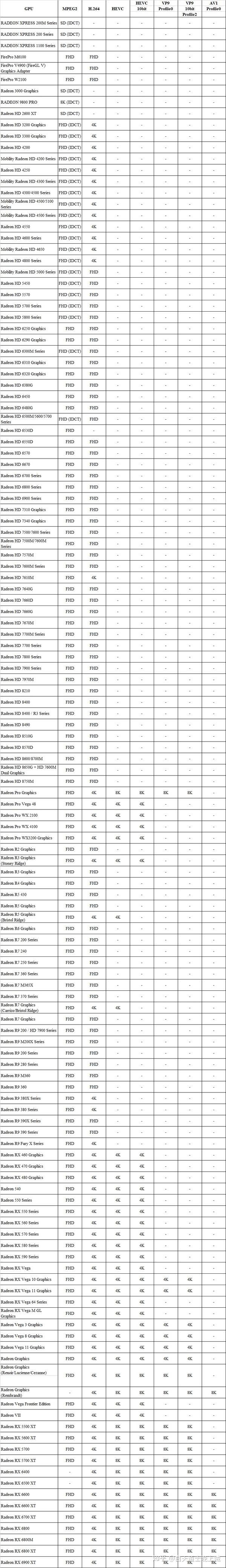A家的独显解码能力属于吊车尾的存在,RX6000才开始支持AV1(低端的6500XT、6400被砍了不支持,需注意)。反倒是锐龙系列APU的集显表现不错,除了AV1其他都支持。