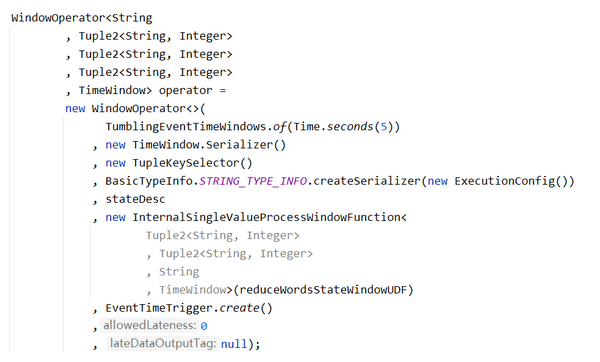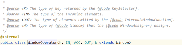 关联一下Flink的源码,你会发现WindowOperator的泛型有4个参数。大家看Flink的缩写非常简洁,一看就知道啥意思了。K – key,表示KeyedStream中进行分流的key类型,我们这里是String。IN – 表示输入的类型,我们将单词转换为元组,所以此处是Tuple2<String, Integer>。文档漏了一个ACC - accumulator,这是累加的意思,就是Tuple2 + Tuple2的类型,我们这儿还是Tuple2。再下来是OUT – 表示输出的类型,仍然是Tuple2。最后一个W – Window的缩写,我们这里是滚动时间窗口,所以是TimeWindow。