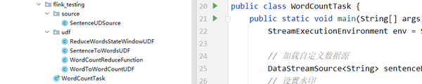 这个Flink程序做的处理很简单,就是实现单词计数。首先我们自定义一个source不断地发出文本,然后我们编写代码进行处理解析,最后用滚动窗口每5秒进行一次计算,并放到有状态的存储中。我们先把程序快速地实现出来。