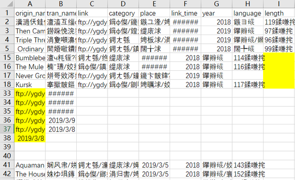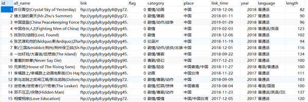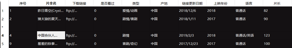 # 写入字段名:片名、译名、链接、类别、产地、发布时间、年代、语言、片长