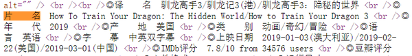 图中可以看到“片名”信息为“◎片 名 How To Train Your Dragon: The Hidden World/How to Train Your Dragon 3 <br />”。于是可以通过正则表达式来定位获取“片名信息”,代码为: