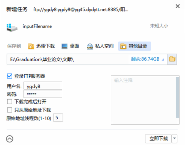 当用户复制下载链接后,点击下载按钮,可以调用迅雷进行影片下载。在迅雷程序下载界面中,可以设置影片文件名、存储路径等信息。下载界面如图所示: