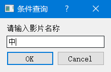 点击“条件查询”,将弹出输入对话框,用来获取用户输入。输入影片名称的相关信息,如“中”字,点击“OK”开始查询。输入对话框如图所示: