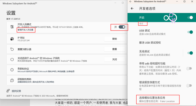 进入安卓子系统管理界面,打开“开发人员模式”,然后点击下方“管理开发人员设置”,在调试>选择模拟位置信息应用>选择Fake Location