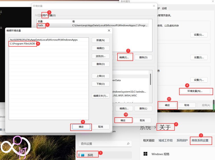 关于每次都要手动找ADB文件夹,在设置>系统>最下面 关于>高级系统设置>下方“环境变量”>选择用户的path变量>选择“编辑”