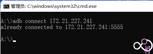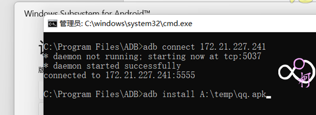 命令进入ADB工具,使用“adb connect [IP]”,链接到子系统。