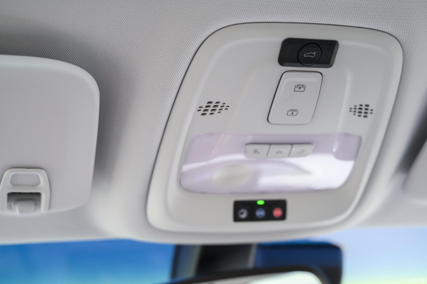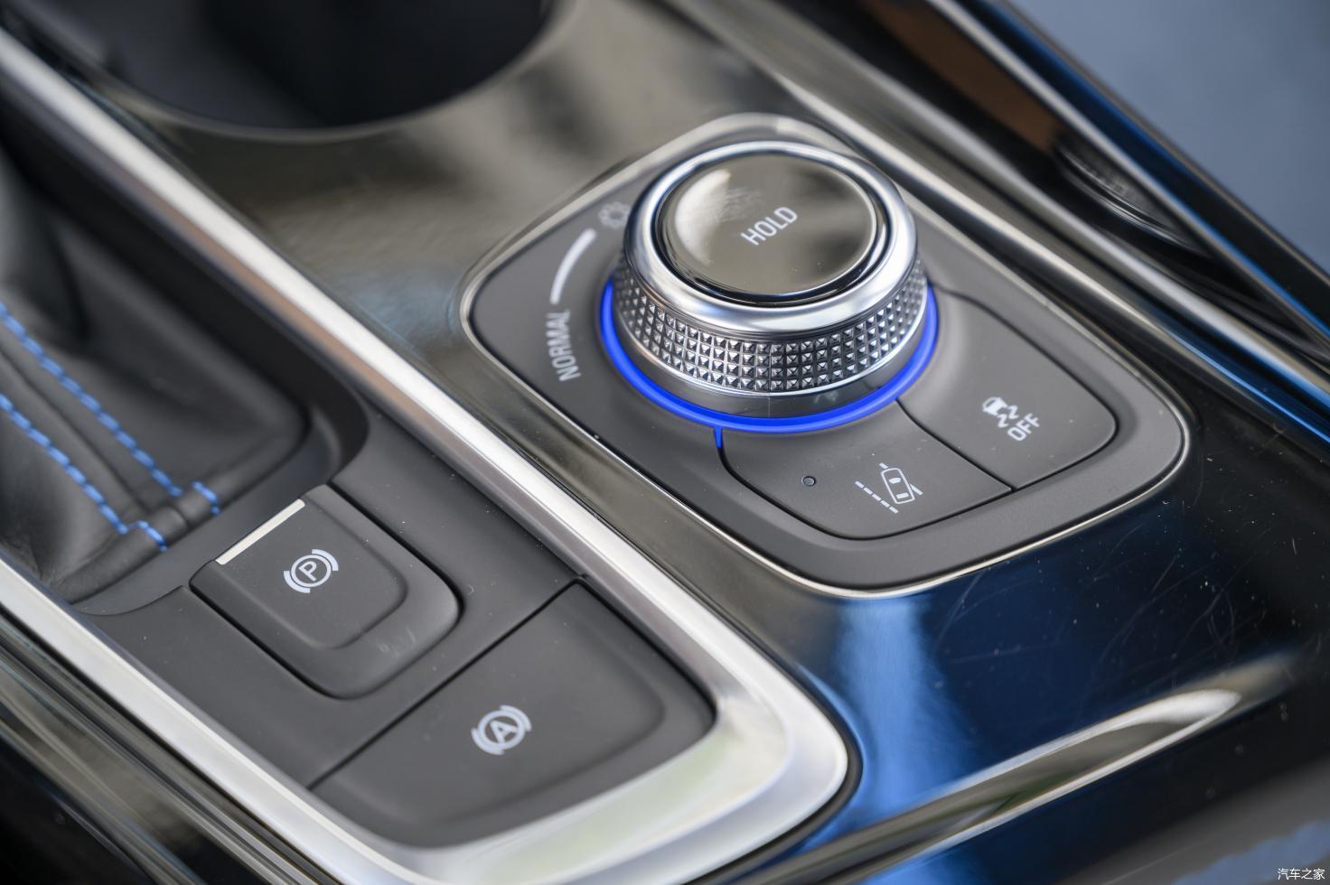 排档杆后方的旋钮并不是中控系统的操作键,而是承担了切换驾驶模式的作用。整车在很多按键的位置都会有淡淡的蓝色光打底,似乎时时刻刻在证明着自己新能源车的身份。另外要注意,该车的后背厢开启按键放在了“安吉星”的位置,初次上手相比得寻找一番。