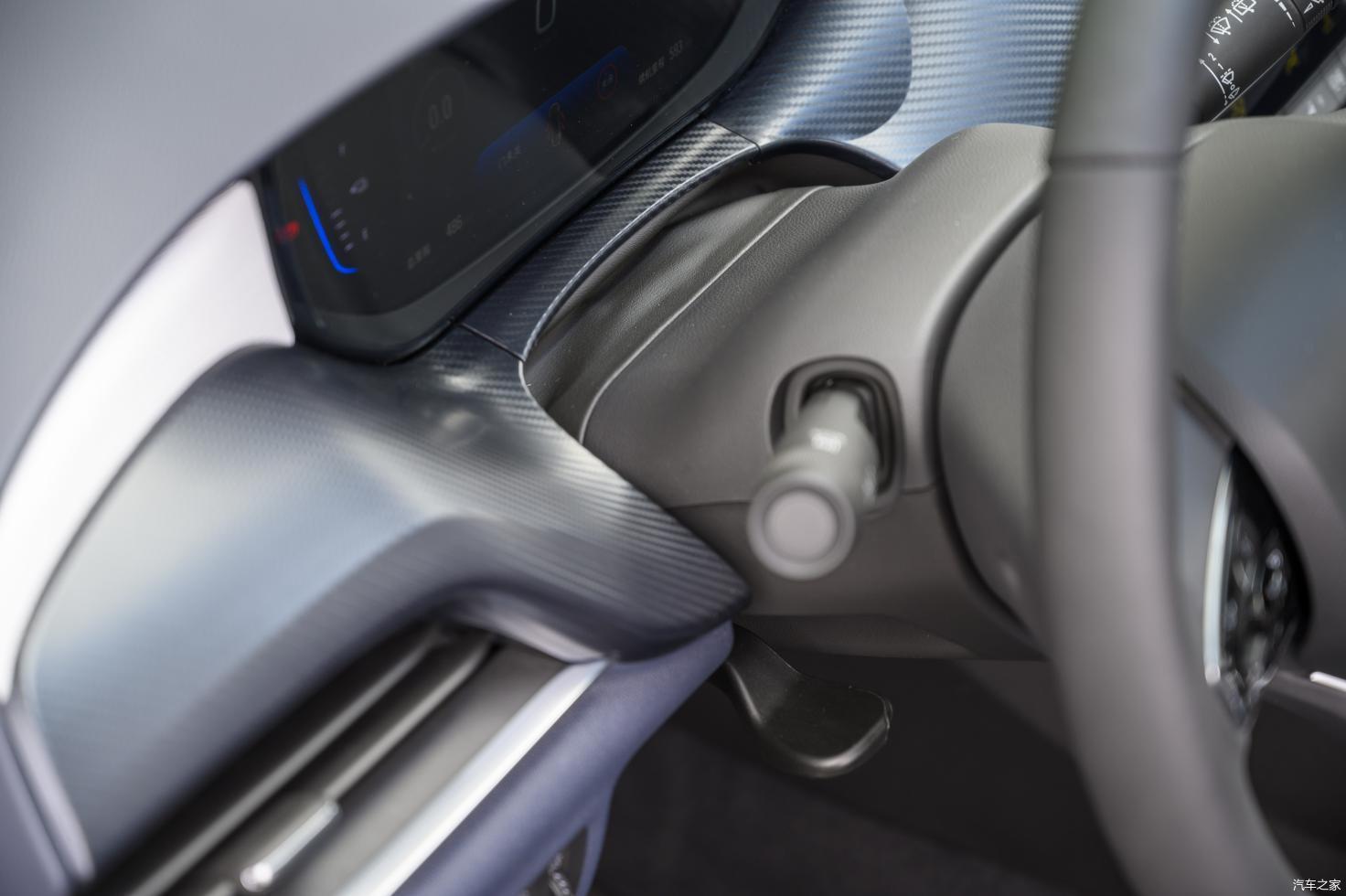 即使在新能源车中,蓝色的启动键也并不多见,排档杆的造型也比较特殊。作为承载着大部分上车后首先操作的“第一第二”配置,这两个配置的实用性决定了消费者的第一感觉。