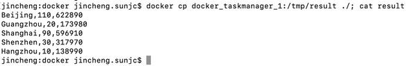 查看执行结果,可以从 TaskManager 的容器中将结果文件拷贝出来查看,执行 docker cp docker_taskmanager_1:/tmp/result ./; cat result。