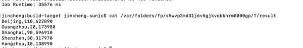 jincheng:build-target jincheng.sunjc$ cat /var/folders/fp/s5wvp3md31j6v5gjkvqbkhrm0000gp/T/result Beijing,110,622890 Guangzhou,20,173980 Shanghai,90,596910 Shenzhen,30,317970 Hangzhou,10,138990