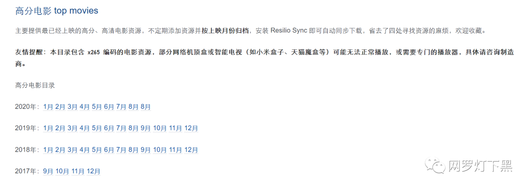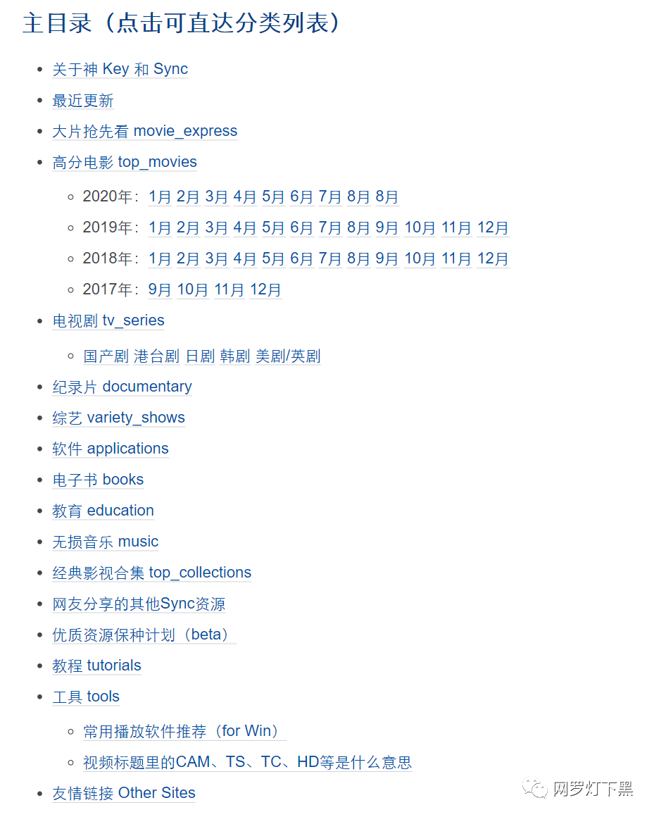 先看主目录,高分电影、电视剧、纪录片、综艺、软件、电子书、无损音乐、经典影视合集等等,还贴心的为你介绍了视频标题里的 CAM、TS、TC、HD 等是什么意思。
