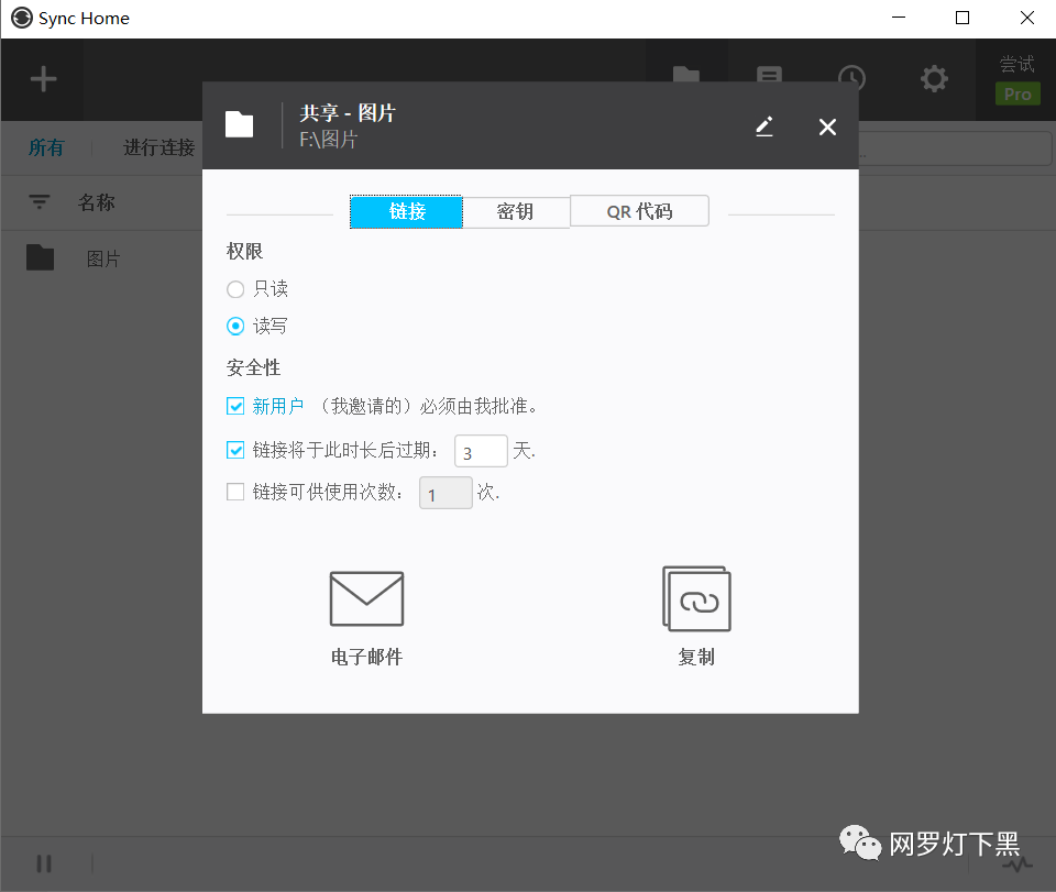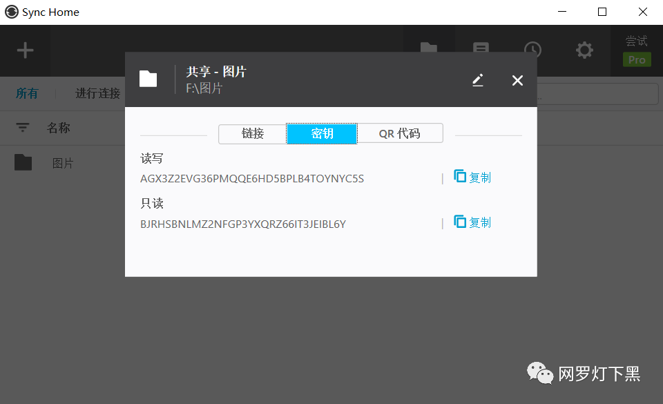 当文件夹分享出去之后,你可以看到获取共享的链接、密钥的对方的在线状态。