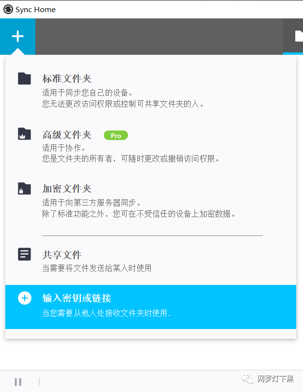 你会看到有好几个选项,标准文件夹、高级文件夹、加密文件夹、共享文件、输入密钥或链接,这些后面也都解释,而且字面意思也很简单,就不用我多说了吧。