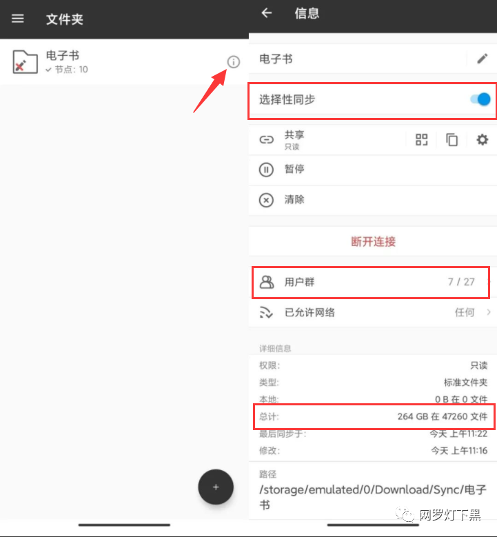 选择性同步在手机上是默认勾选的,也是免费的,因为如果不开启选择性同步,软件会把整个文件内容同步下载下来,而这些最后有 200 多 G,手机不像电脑,肯定容不下。
