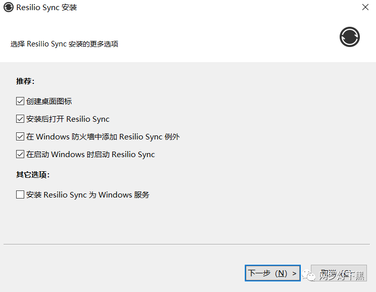 最下面安装 Resilio Sync 为 Windows 服务那里,如果非 NAS 用途的电脑就不要勾选。