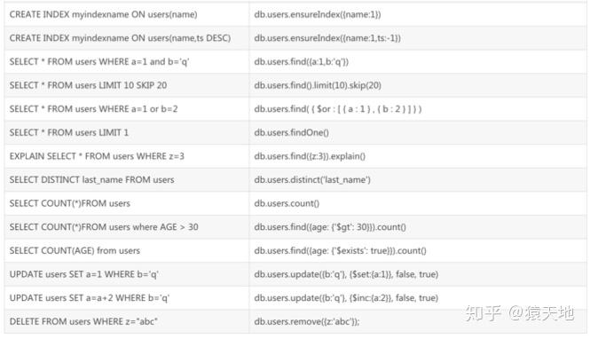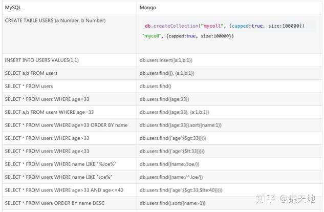 | Mysql | MongoDB | |:----|:----| | Database(数据库) | Database(数据库) | | Table(表) | Collection(集合) | | Row(行) | Document(文档) | | Column(列) | Field(字段) |