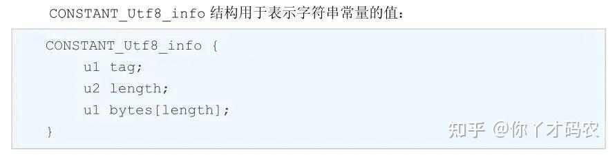 这里定义的 u2 string_index 表示的是常量池的有效索引,其类型是CONSTANT_Utf8_info 结构体表示的,这里我们需要注意的是其中定义的length我们看下面这张图。