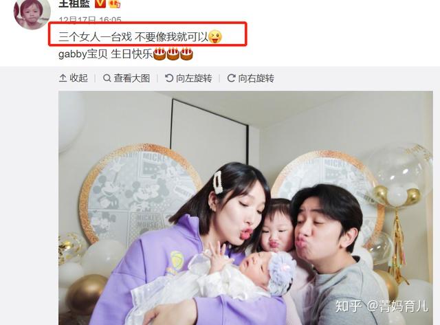 2018年生下大女儿,大女儿没到两岁,开始追二胎,2020年6月份宣布怀上二胎,12月17日 王祖蓝在社交平台上晒一家四口的全家福 , “三个女人一台戏,不要像我就行” 看来王祖蓝还是挺会自嘲的。