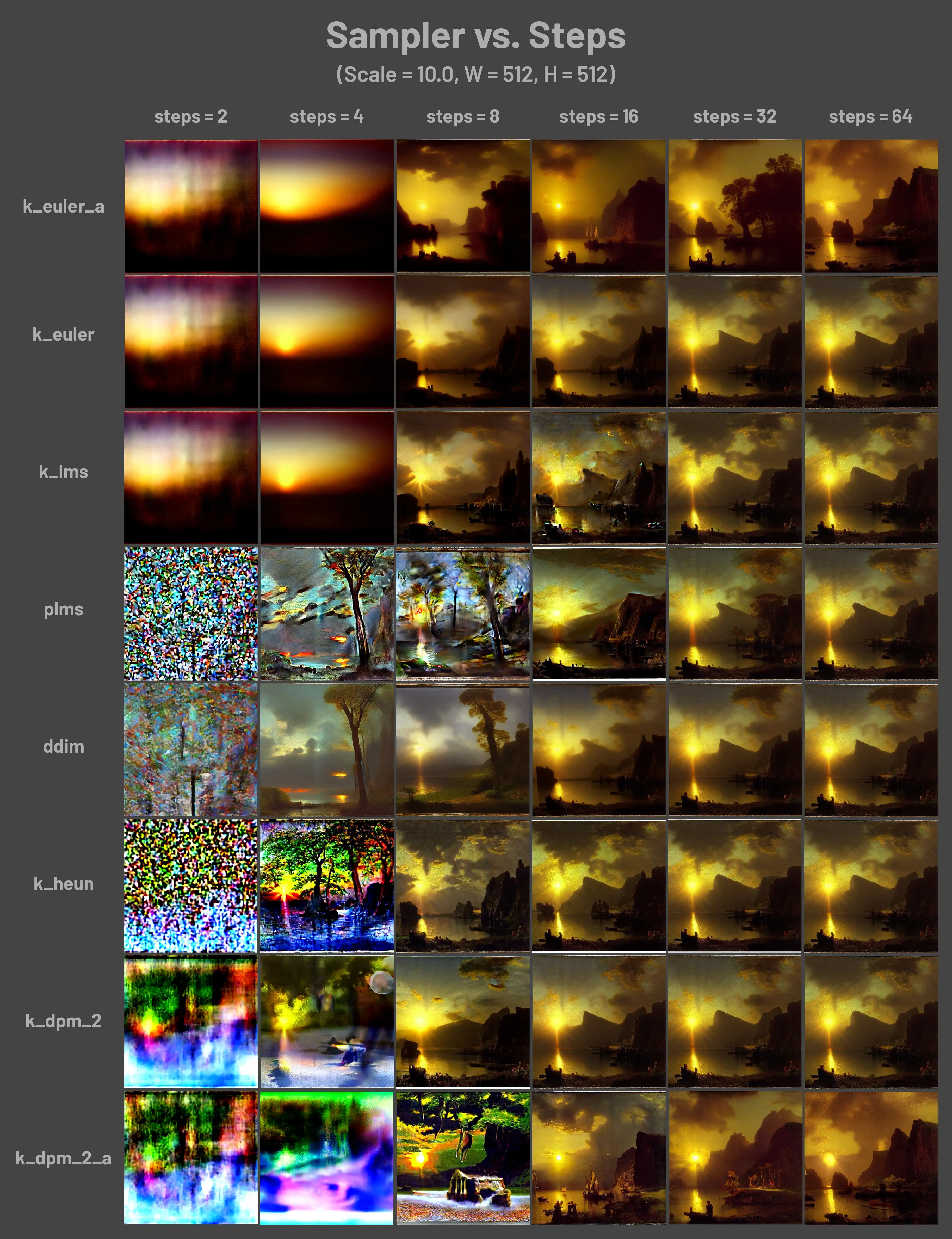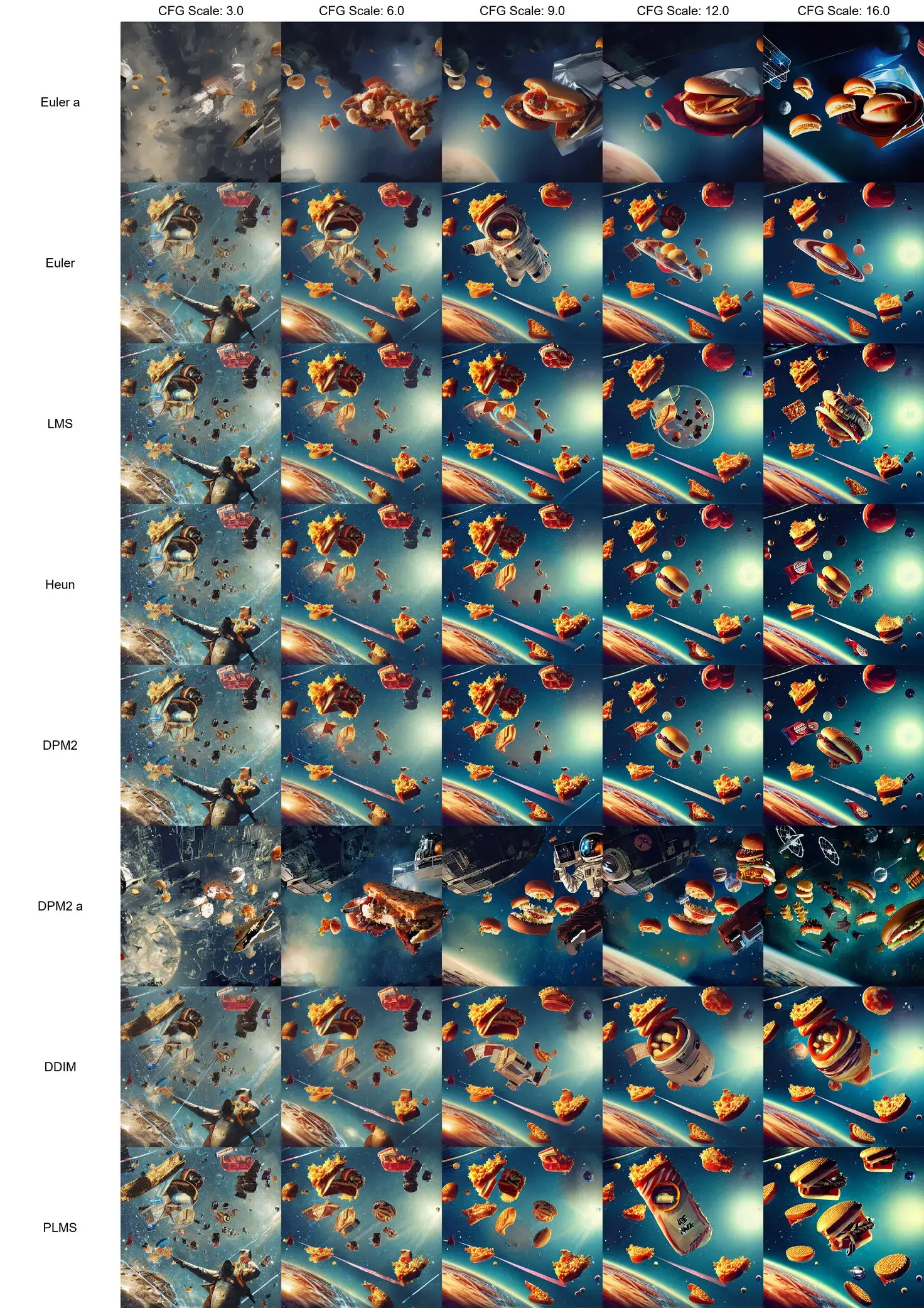 - Euler a 更多样,不同步数可以生产出不同的图片。但是太高步数 (>30) 效果不会更好。