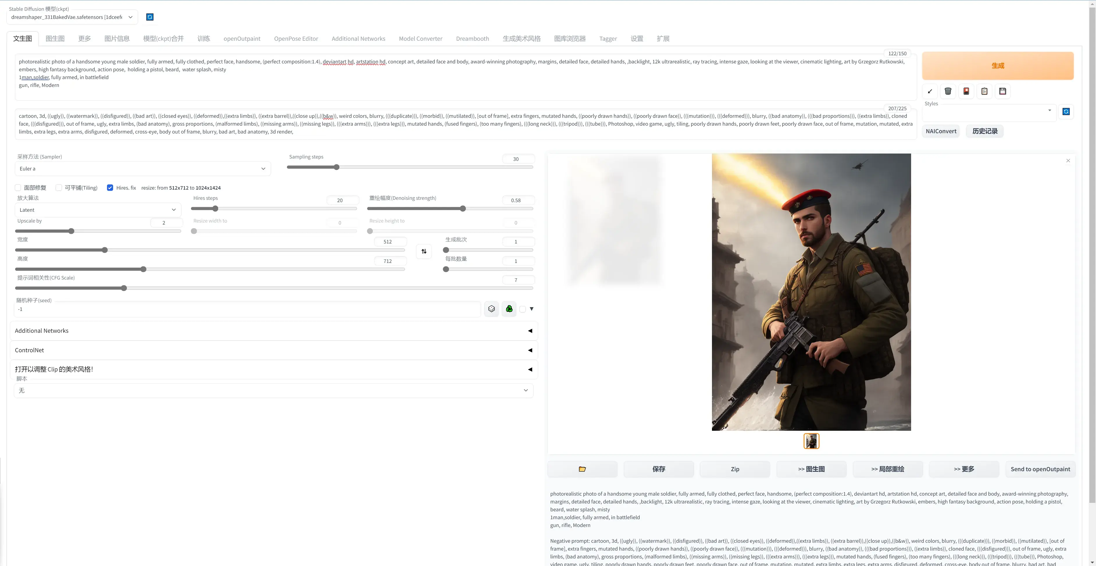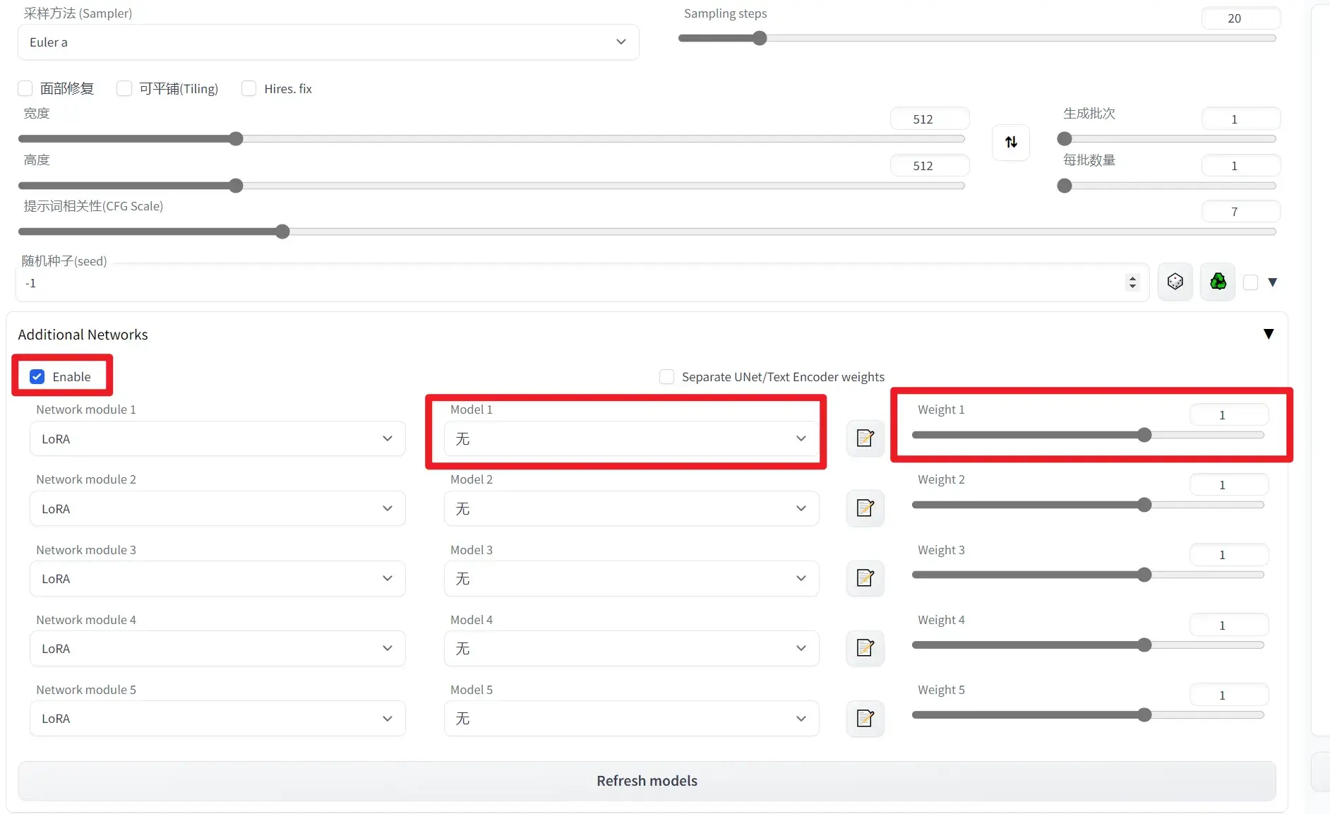 对人物、姿势、物体表现较好的模型,在 ckpt 模型上附加使用。 在 webui 界面的 Additional Networks 下勾线 Enable 启用,然后在 Model 下选择模型,并可用 Weight 调整权重。权重越大,该 Lora 的影响也越大。 不建议权重过大(超过 1.2),否则很容易出现扭曲的结果。