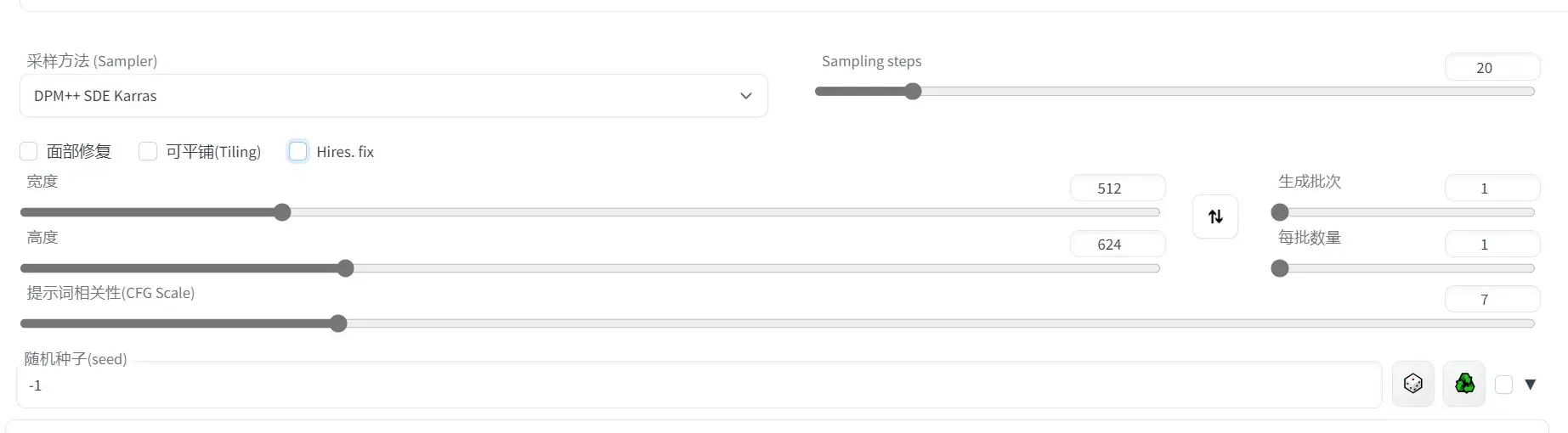 - 生成批次 每次生成图像的组数。一次运行生成图像的数量为“批次* 批次数量”。