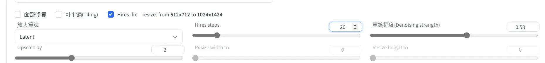 - 尺寸 指定图像的长宽。出图尺寸太宽时,图中可能会出现多个主体。1024 之上的尺寸可能会出现不理想的结果,推荐使用小尺寸分辨率+高清修复(Hires fix)。