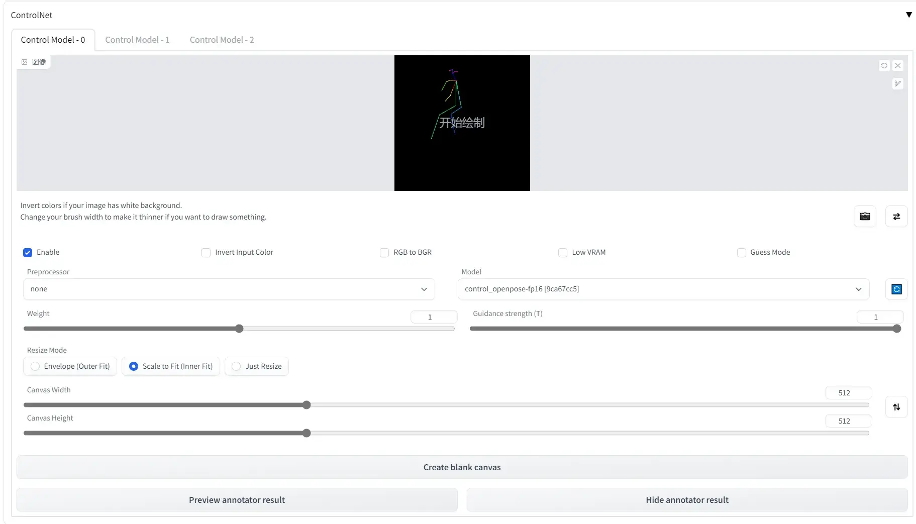 - Preprocessor 指预处理器,它将对输入的图像进行预处理。如果图像已经符合预处理后的结果,请选择 None。譬如,图中导入的图像已经是 OpenPose 需要的骨架图,那么 preprocessor 选择 none 即可。