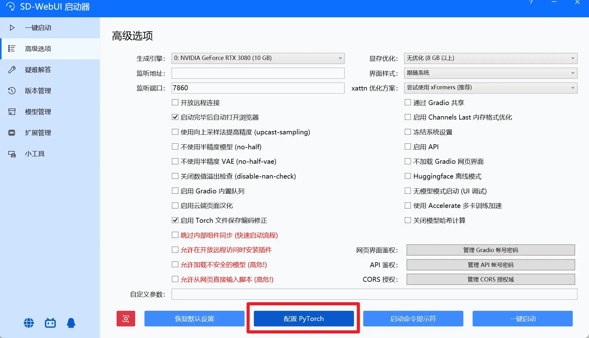 如果报错提示缺少 Pytorch,则需要在启动器中点击配置: