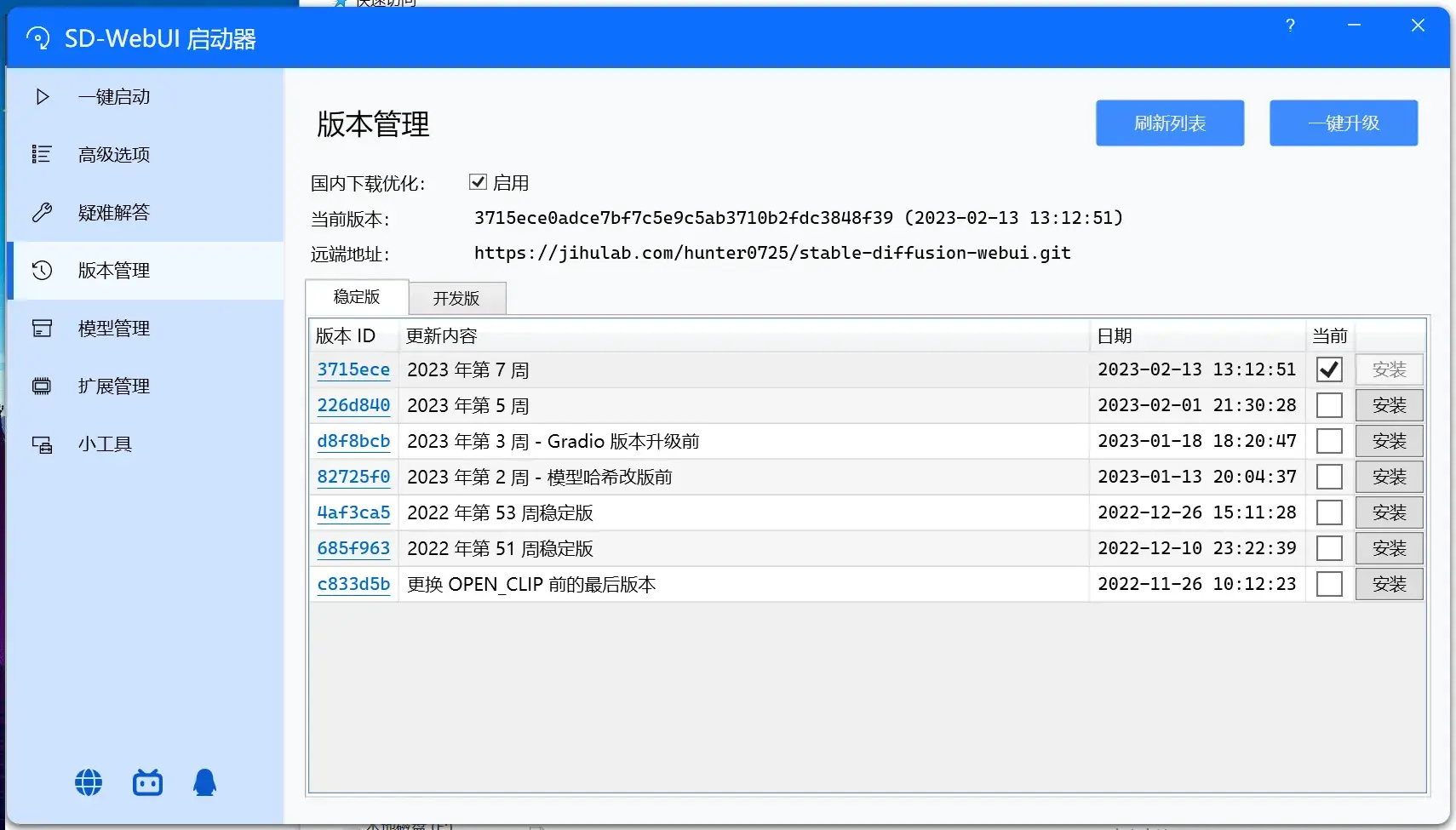 Stable Diffusion webui 的更新比较频繁,请根据需求在“版本管理”目录下更新: