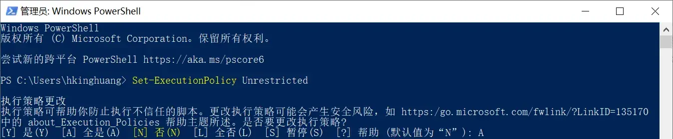 - 首先,以管理员模式启动 Powershell,执行“Set-ExecutionPolicy Unrestricted”命令,并回答“A"。然后可以关闭该窗口。