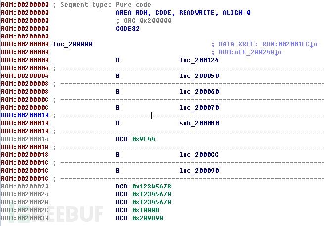 可以通过对比ARM代码最开始部分的中断向量表结构手动识别,常见的入口代码如下所示。