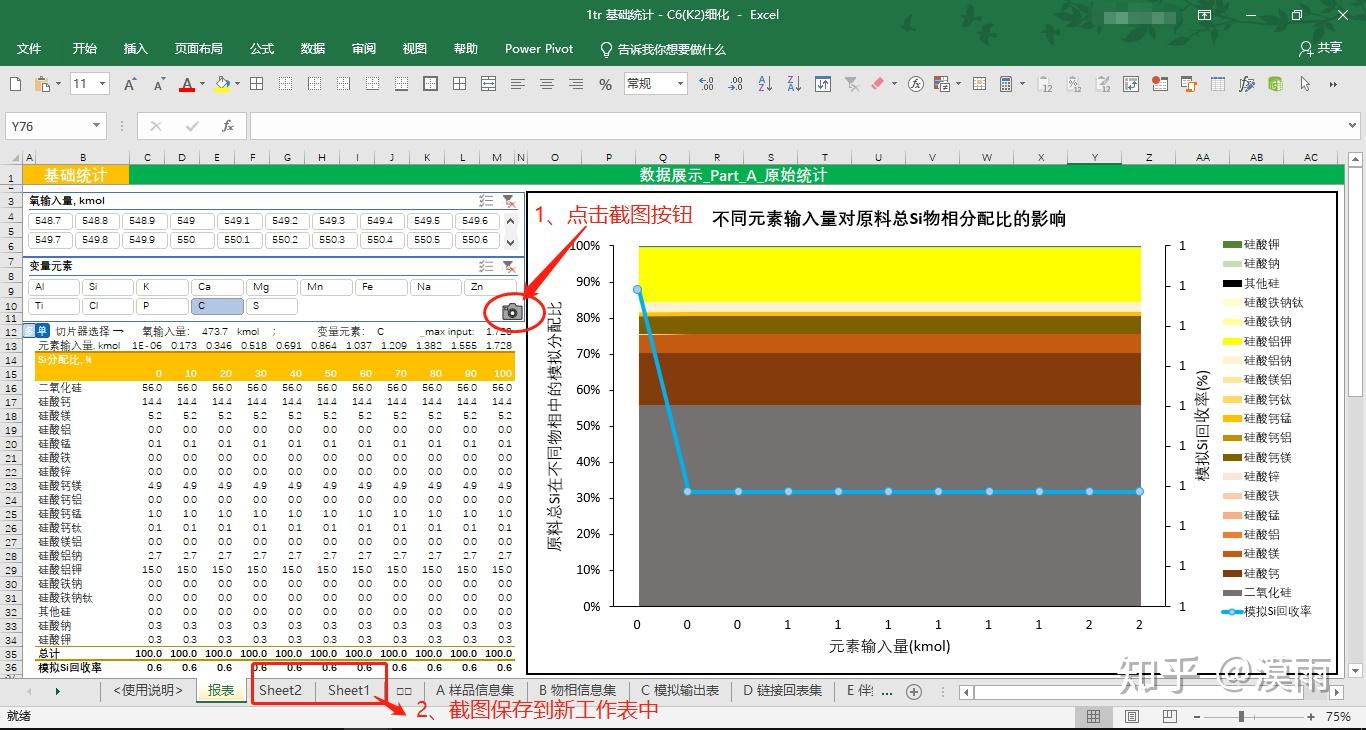 本人用excel做了一份数据分析报表,通过在切片器中选定参数,报表可展示出不同的图表。为了方便图表间的对比,在报表中设置了截图按钮(图中的照相机)并指定对应的vba宏; 通过点击截图按钮,可将报表中的内容以图片形式保存到新的工作表中 ;然后使用Ctrl+PageUp/PageDown快捷键,就可以在这些工作表之间来回切换,达到类似动图的效果,从而方便对比不同参数影响下的图表。