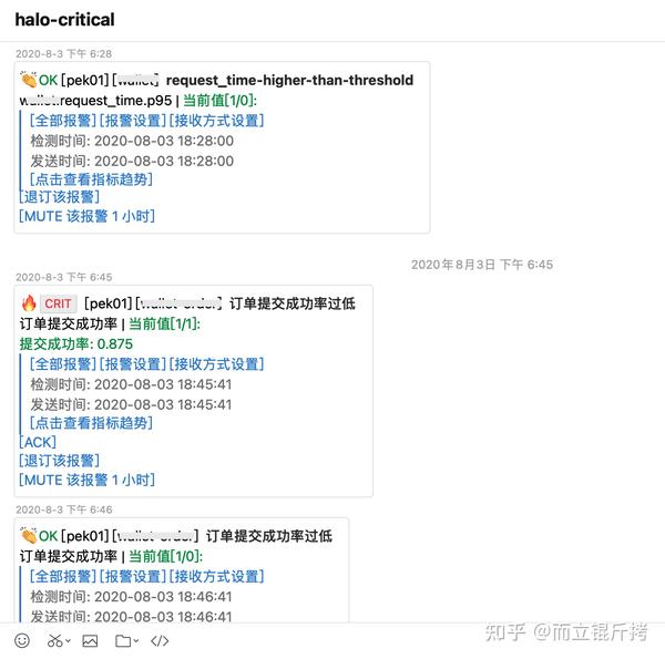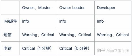 首先我们要在交易的黄金链路上制定比较严格的告警指标,从下单、提单、确认支付到履约发货的每个环节做好配置,配置的严重程度依次递增分为 Info、Warning、Critical。按照人员类别和通知手段来举例说明告警渠道:
